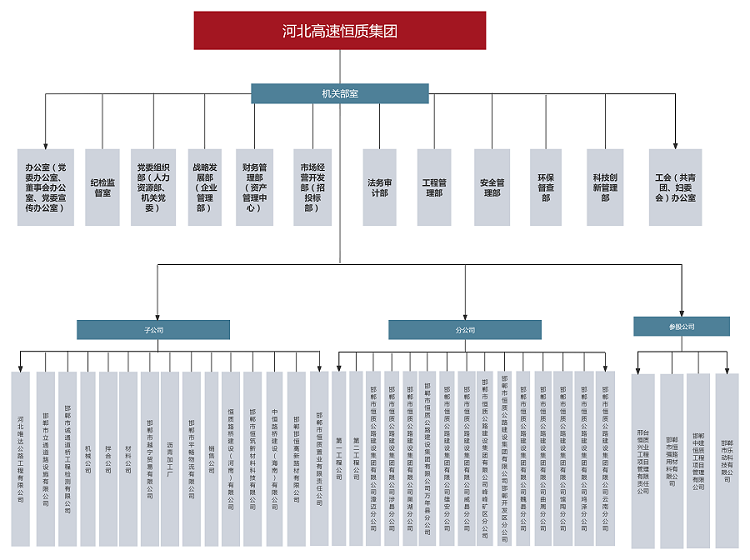 河北高速恒質(zhì)公路建設(shè)集團(tuán)有限公司始建于2004年,前身是邯鄲市恒質(zhì)公路建設(shè)集團(tuán)有限公司。2024年7月成為河北高速公路集團(tuán)有限公司二級(jí)子公司,現(xiàn)有職工500余人,下轄18家子公司13個(gè)分公司,參股公司3家 ,注冊(cè)資本7億元,是一家集公路工程施工、路用材料研發(fā)生產(chǎn)、試驗(yàn)檢測(cè)、瀝青貿(mào)易、公鐵物流于一體的多元化、綜合性單位,國(guó)家級(jí)高新技術(shù)企業(yè),河北省專精特新中小企業(yè),河北省首家瀝青拌合環(huán)保引領(lǐng)性企業(yè)。